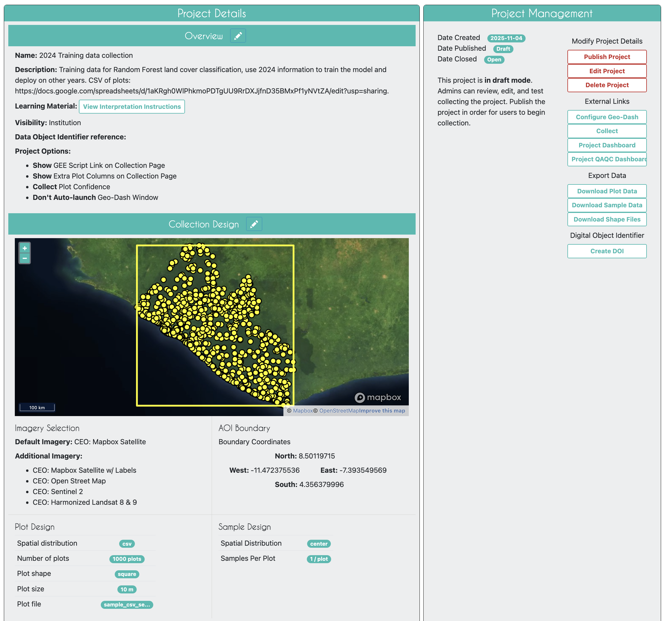 Build a very simple CEO project to collect training data. The data collected should be for the land cover in 2024.