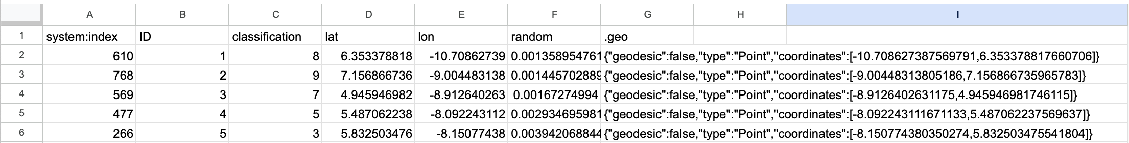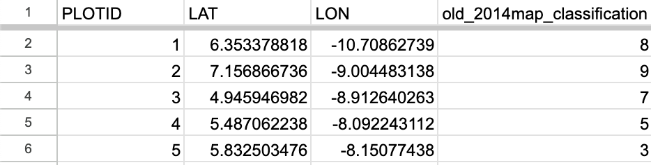 Clean up the columns so they look like this. You can remove the extraneous columns (system:index, random, .geo). Rename the ID column to “PLOTID”, the classification to a clearer “old_2014map_classification”, lat to “LAT”, and lon to “LON”. The final version will look like this: