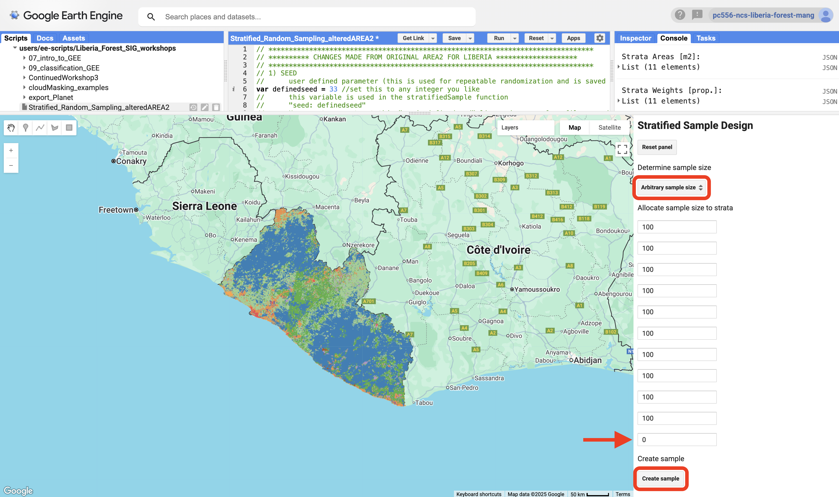 We will use AREA2 (local version in our repository) to easily generate locations for these samples. The local version of the AREA2 user interface already references the map asset and correct spatial resolution. It also has the addition of allowing specification of a randomization seed. If you use the same seed you can re-generate the same set of ‘random’ points. If you change the seed you will have a new set of point locations.